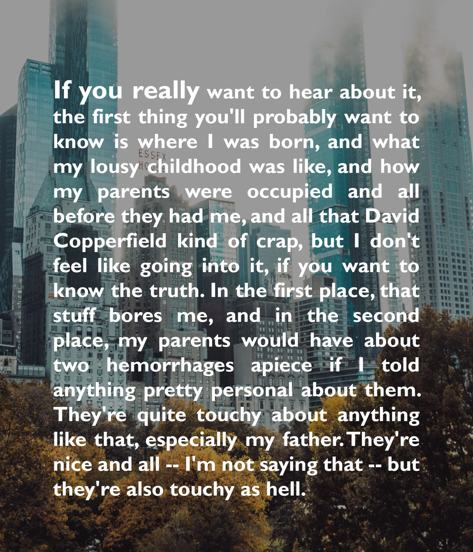 Jeg tror det som avgjør om du liker romanen eller ikke, er hvorvidt du sympatiserer og identifiserer deg med hovedpersonen Holden Caulfield, eller om du avviser ham som sutrete drittunge. For å finne ut av hvor du står, kan du teste deg selv på romanens første paragraf: